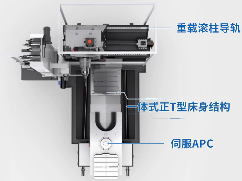 本系列机床采用T型床身结构设计,采用高刚性滚柱线性导轨,导轨跨距大,机床整体刚性好,承载能力强;适合对箱体、机床底座、立柱等多面体零件的加工,可实现一次装夹完成铣面、镗孔、攻丝等多工序的粗、精加工,保证了零件的精度要求。双工作台可以大大节省工件的装夹时间,提高机床使用效率。